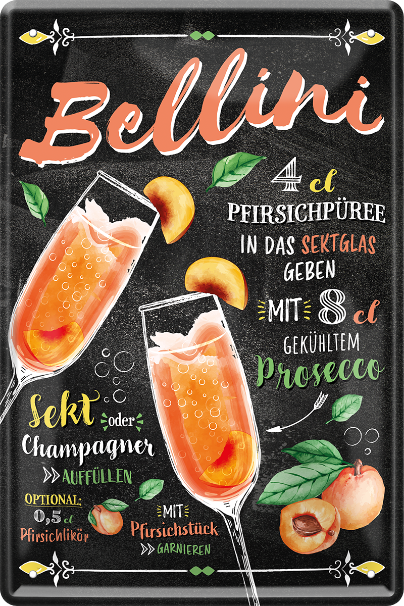 Das Blechschild ''Bellini'' ist aus einem qualitativ hochwertigen Blech mit abgerundeten und umgeschlagenen Kanten. Ideal für Liebhaber und Fans von "alkoholischen Getränken" und definitiv ein Hingucker für jedermanns Auge.
