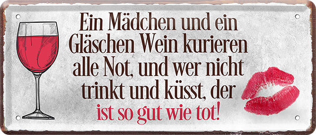 Blechschild ''Ein Mädchen und ein Gläschen Wein kurieren alle Not'' 28x12cm
