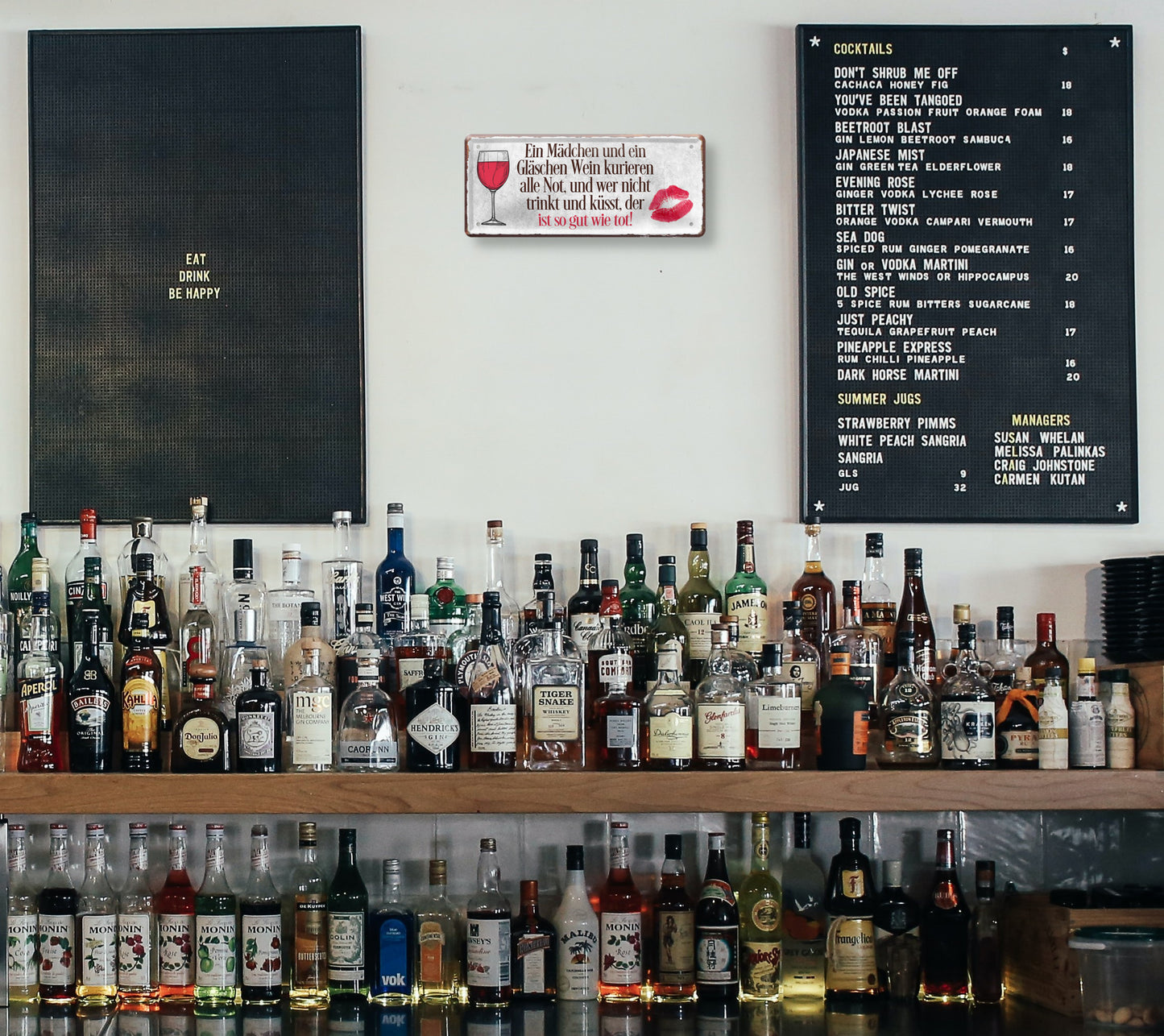 Das Blechschild ''Ein Mädchen und ein Gläschen Wein kurieren alle Not'' ist aus einem qualitativ hochwertigen Blech mit abgerundeten und umgeschlagenen Kanten. Ideal für Liebhaber und Fans von "alkoholischen Getränken" und definitiv ein Hingucker für jedermanns Auge.