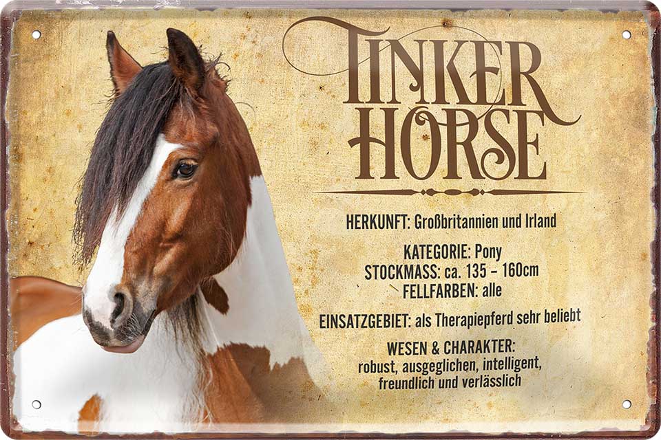 Das Blechschild ''Tinker'' ist aus einem qualitativ hochwertigen Blech mit abgerundeten und umgeschlagenen Kanten. Ideal für Liebhaber und Fans von ''Reitsport und Pferden'' und definitiv ein Hingucker für jedermanns Auge.