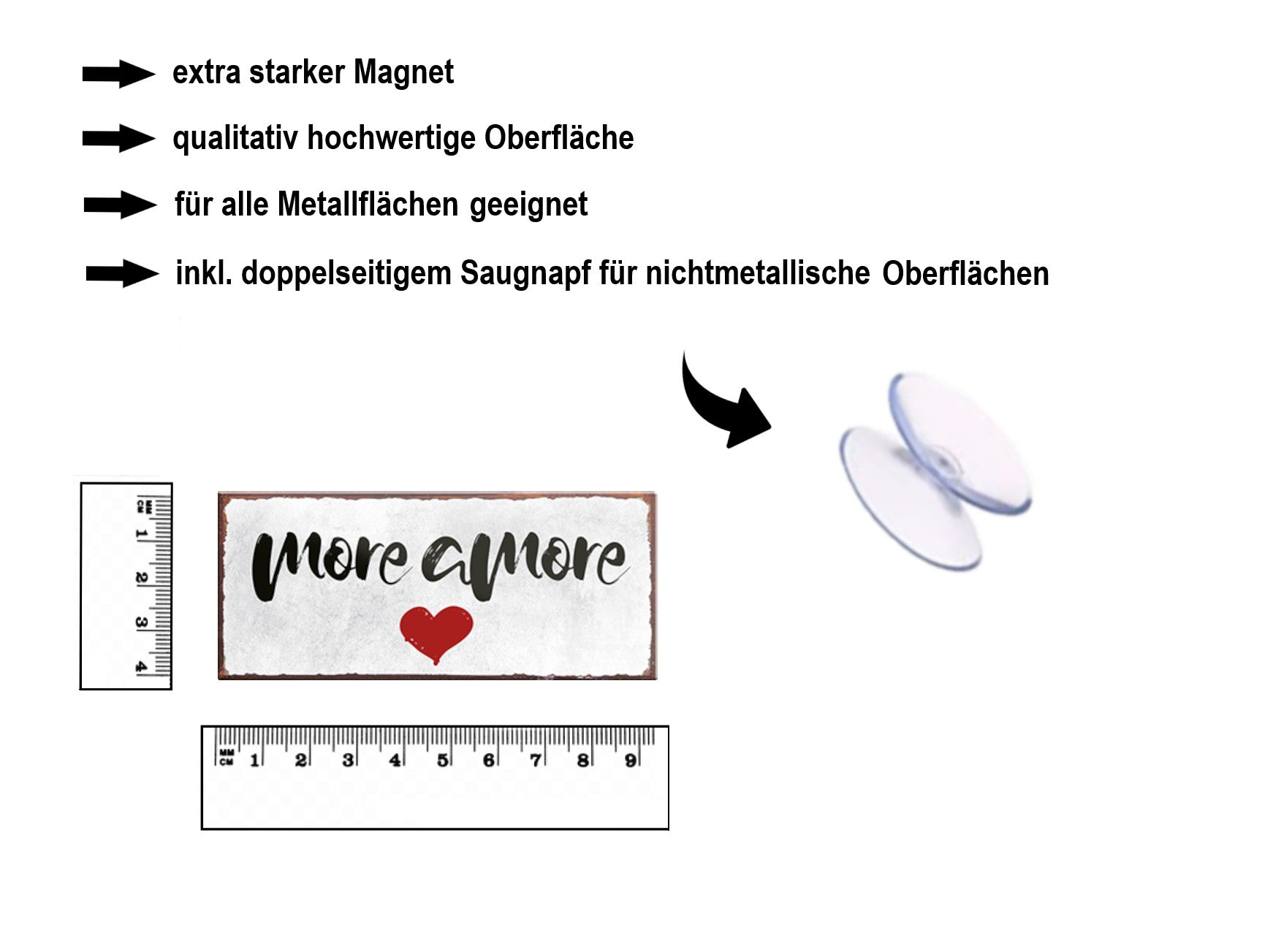 Der Super-Magnet ''More Amore'' ist aus einem langlebigen Metall mit qualitativ hochwertiger Oberfläche. Ideal für Liebhaber und Fans von ''Romantik und Liebe'' und definitiv ein Hingucker für jedermanns Auge.