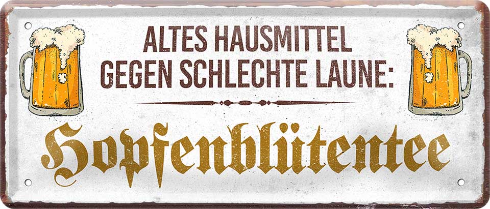 Blechschild ''Altes Hausmittel gegen schlechte Laune. Hopfenblütentee'' 28x12cm