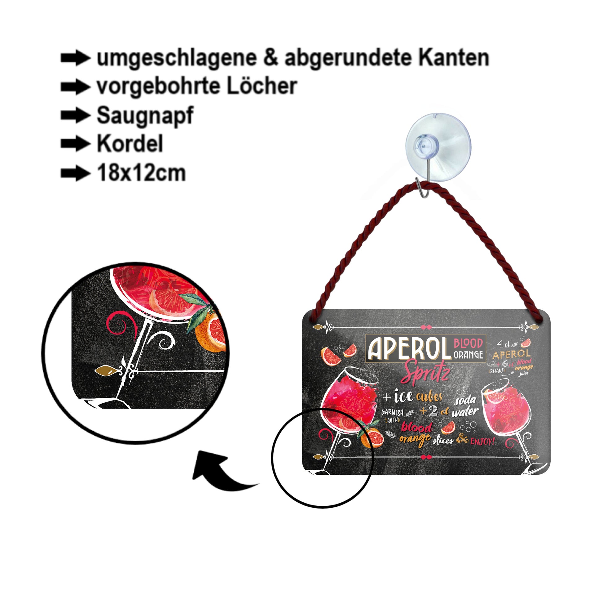 Das Blechschild ''Aperol Spritz Blood Orange'' ist aus einem qualitativ hochwertigen Blech mit abgerundeten und umgeschlagenen Kanten. Ideal für Liebhaber und Fans von "leckeren Cocktails" und definitiv ein Hingucker für jedermanns Auge.