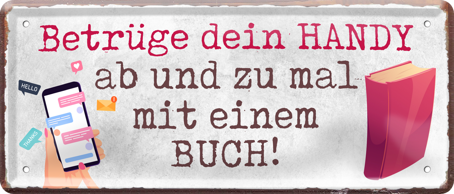 Blechschild ''Betrüge dein Handy ab und zu mal mit Buch'' 28x12cm