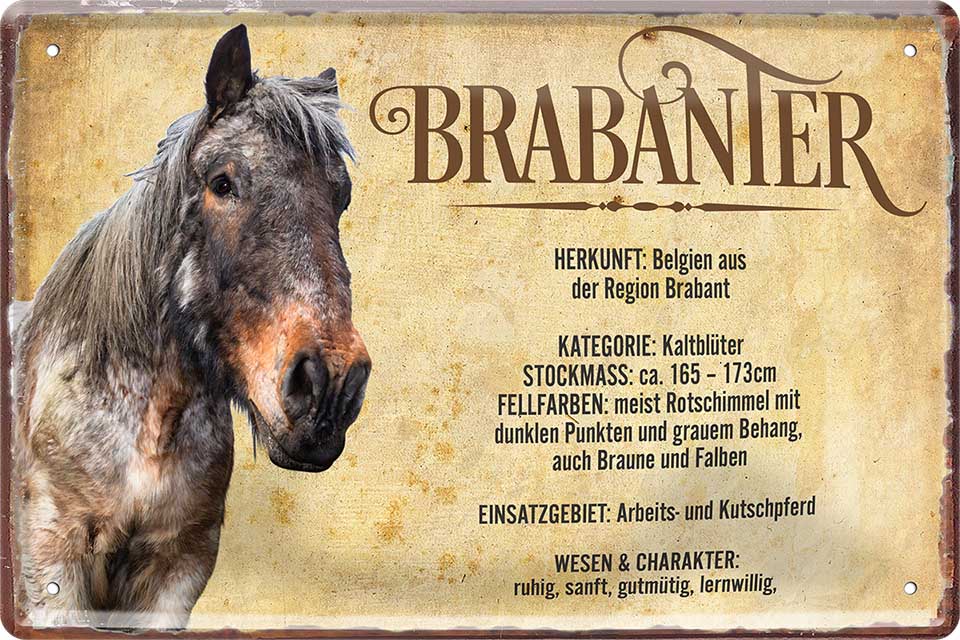 Das Blechschild ''Brabanter'' ist aus einem qualitativ hochwertigen Blech mit abgerundeten und umgeschlagenen Kanten. Ideal für Liebhaber und Fans von ''Reitsport und Pferden'' und definitiv ein Hingucker für jedermanns Auge.