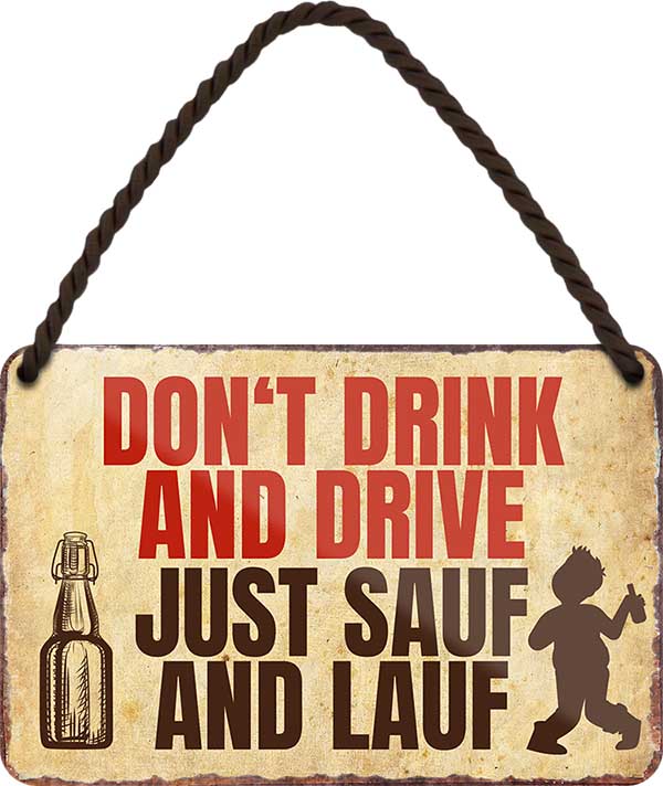 Das Blechschild ''dont drink and drive, just sauf and lauf'' ist aus einem qualitativ hochwertigen Blech mit abgerundeten und umgeschlagenen Kanten. Ideal für Liebhaber und Fans von „alkoholischen Getränken“ und definitiv ein Hingucker für jedermanns Auge.
