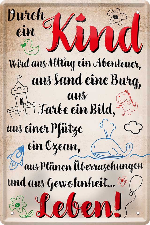 Blechschild ''Durch ein Kind aus Alltag Abenteuer und Gewohnheit Leben'' 20x30cm