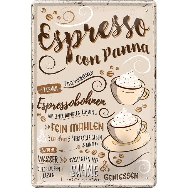 Das Blechschild ''Espresso con Panna'' ist aus einem qualitativ hochwertigen Blech mit abgerundeten und umgeschlagenen Kanten. Ideal für Liebhaber und Fans von "genüsslichem Essen und Getränken" und definitiv ein Hingucker für jedermanns Auge.