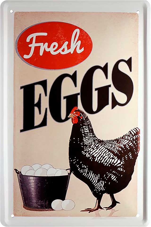Das Blechschild ''Fresh Eggs'' ist aus einem qualitativ hochwertigen Blech mit abgerundeten und umgeschlagenen Kanten. Ideal für Liebhaber und Fans von ''ironischem und sarkastischem Humor'' und definitiv ein Hingucker für jedermanns Auge.