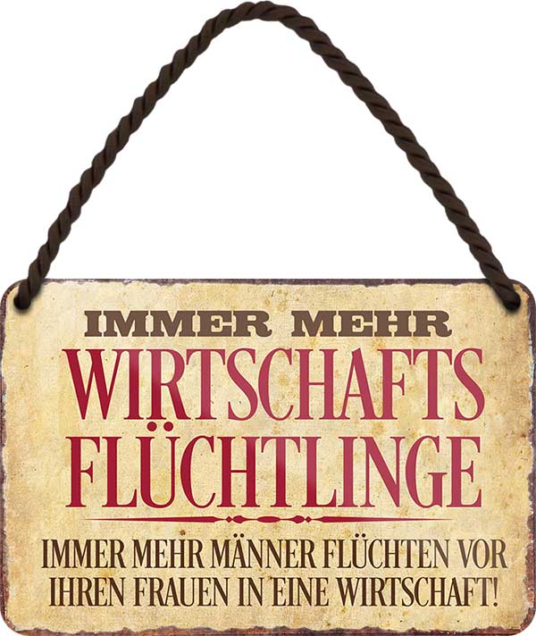 Das Blechschild ''immer mehr Wirtschafts Flüchtlinge.. Frauen in eine Wirtschaft'' ist aus einem qualitativ hochwertigen Blech mit abgerundeten und umgeschlagenen Kanten. Ideal für Liebhaber und Fans von „alkoholischen Getränken“ und definitiv ein Hingucker für jedermanns Auge.