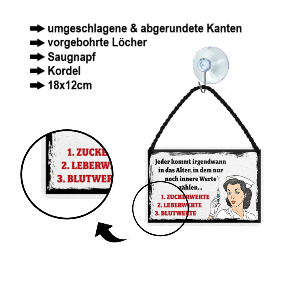 · Blechschilder in den Größen 18x12 cm mit Saugnapf und Kordel, 18x14 cm (oval) mit