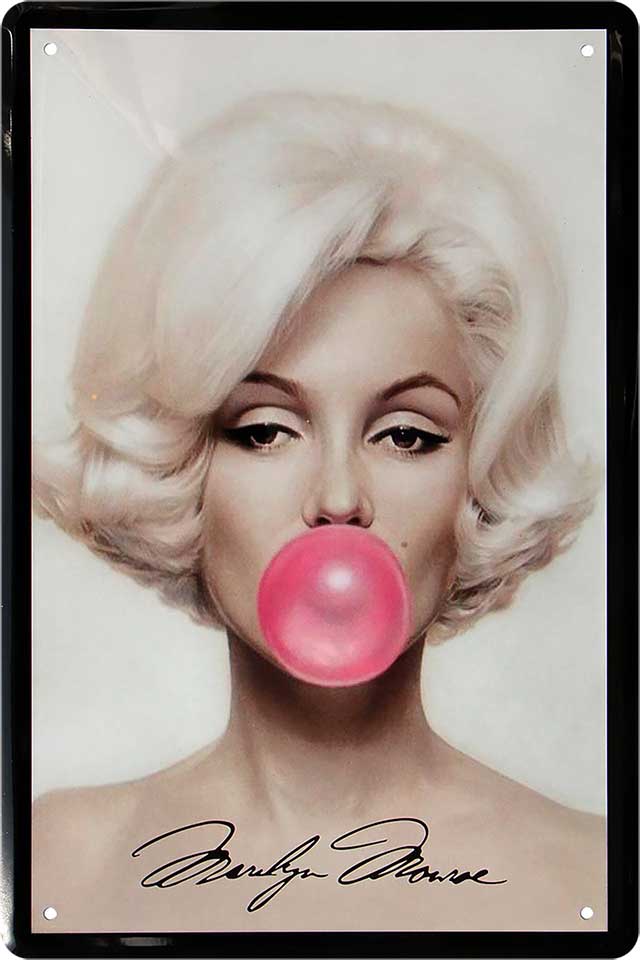Das Blechschild ''Marilyn Monroe Kaugummi'' ist aus einem qualitativ hochwertigen Blech mit abgerundeten und umgeschlagenen Kanten. Ideal für Liebhaber und Fans von ''Stars und Sternchen'' und definitiv ein Hingucker für jedermanns Auge.