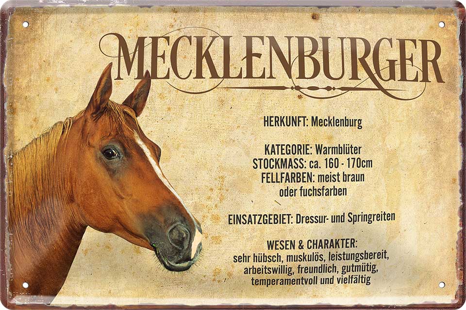 Das Blechschild ''Mecklenburger'' ist aus einem qualitativ hochwertigen Blech mit abgerundeten und umgeschlagenen Kanten. Ideal für Liebhaber und Fans von ''Reitsport und Pferden'' und definitiv ein Hingucker für jedermanns Auge.