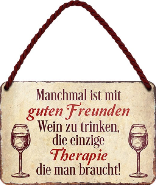 Blechschild ''mit guten Freunden Wein trinken einzige Therapie'' 18x12cm
