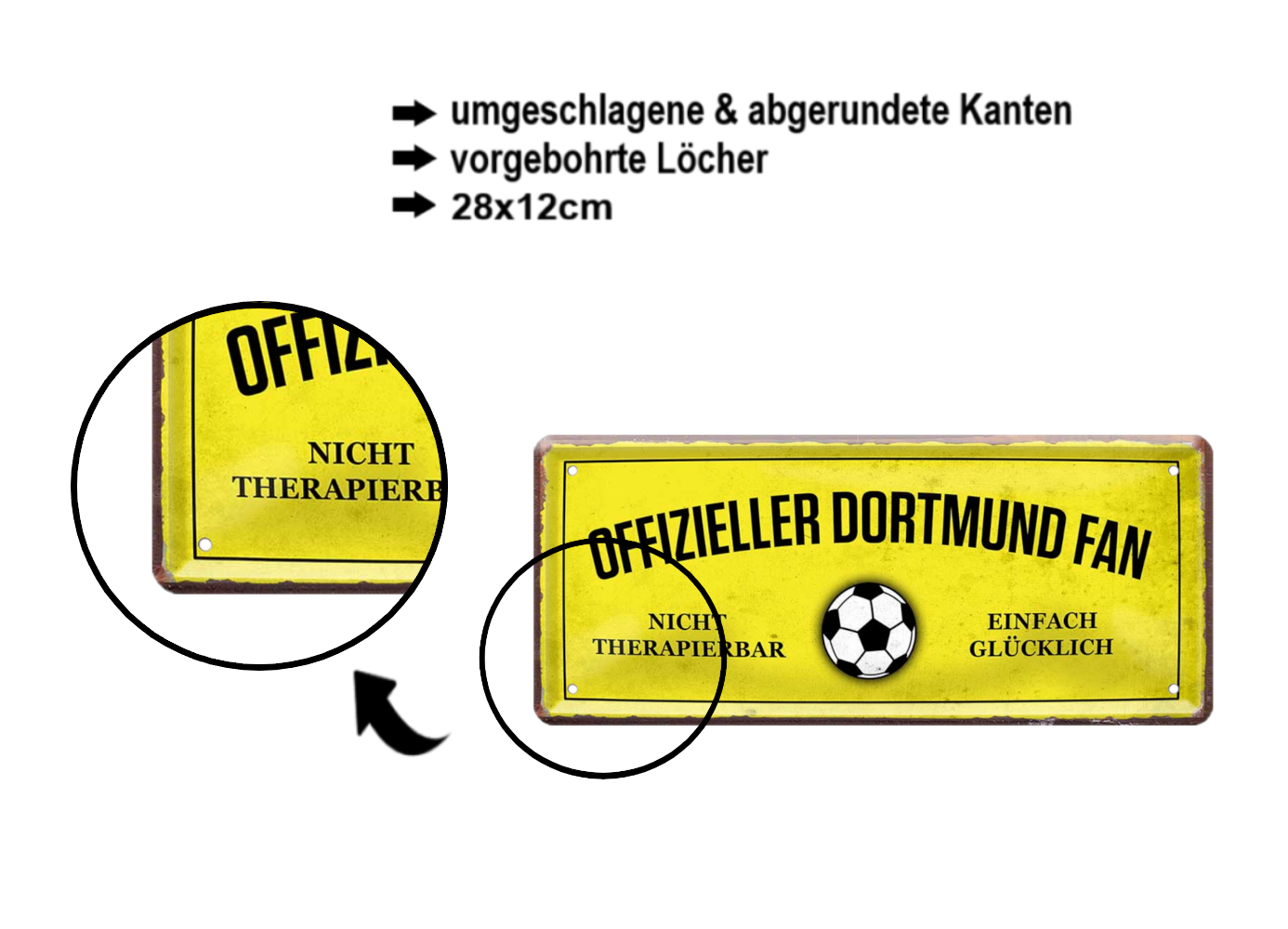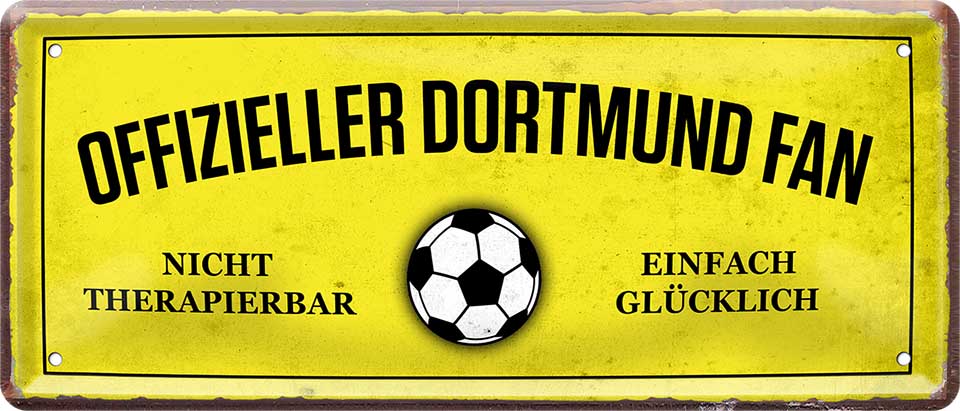 Das Blechschild ''Offizieller Dortmund Fan'' ist aus einem qualitativ hochwertigen Blech mit abgerundeten und umgeschlagenen Kanten. Ideal für Liebhaber und Fans von "Fußball und Vereinen" und definitiv ein Hingucker für jedermanns Auge.