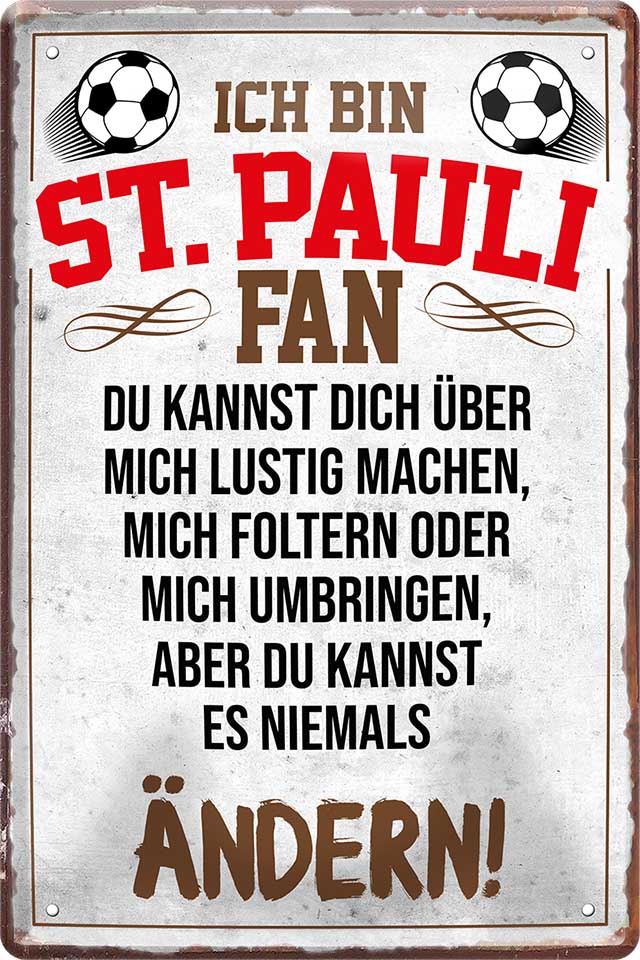 Das Blechschild ''Pauli Fan ´20'' ist aus einem qualitativ hochwertigen Blech mit abgerundeten und umgeschlagenen Kanten. Ideal für Liebhaber und Fans von "Fußball und Vereinen" und definitiv ein Hingucker für jedermanns Auge.