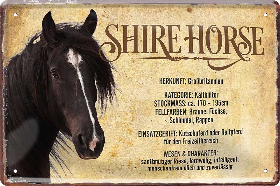 Das Blechschild ''Shire'' ist aus einem qualitativ hochwertigen Blech mit abgerundeten und umgeschlagenen Kanten. Ideal für Liebhaber und Fans von ''Reitsport und Pferden'' und definitiv ein Hingucker für jedermanns Auge.