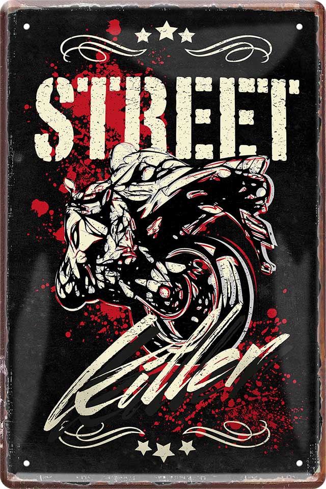 Das Blechschild ''Street Killer'' ist aus einem qualitativ hochwertigen Blech mit abgerundeten und umgeschlagenen Kanten. Ideal für Liebhaber und Fans von ''Motoren und Geschwindigkeit'' und definitiv ein Hingucker für jedermanns Auge.