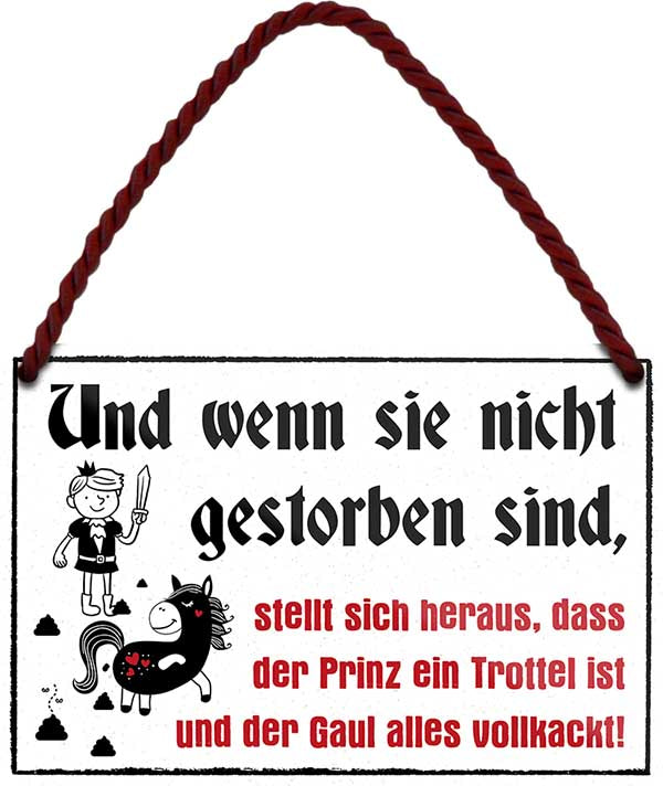 Das Blechschild ''Und wenn sie nicht gestorben sind,... der Gaul alles vollkackt'' ist aus einem qualitativ hochwertigen Blech mit abgerundeten und umgeschlagenen Kanten. Ideal für Liebhaber und Fans von ''ironischem und sarkastischem Humor'' und definitiv ein Hingucker für jedermanns Auge.