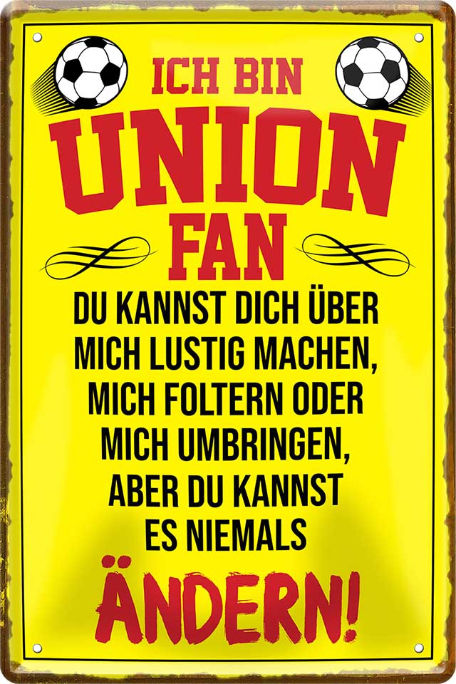 Das Blechschild ''Union Fan ´19'' ist aus einem qualitativ hochwertigen Blech mit abgerundeten und umgeschlagenen Kanten. Ideal für Liebhaber und Fans von "Fußball und Vereinen" und definitiv ein Hingucker für jedermanns Auge.