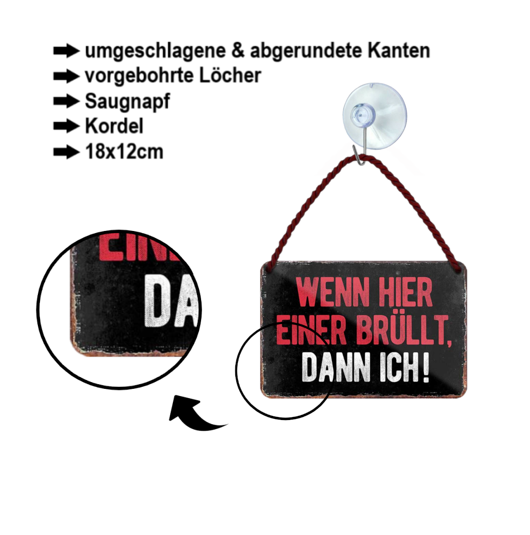 Das Blechschild ''Wenn hier einer brüllt, dann ich'' ist aus einem qualitativ hochwertigen Blech mit abgerundeten und umgeschlagenen Kanten. Ideal für Liebhaber und Fans von ''ironischem und sarkastischem Humor'' und definitiv ein Hingucker für jedermanns Auge.