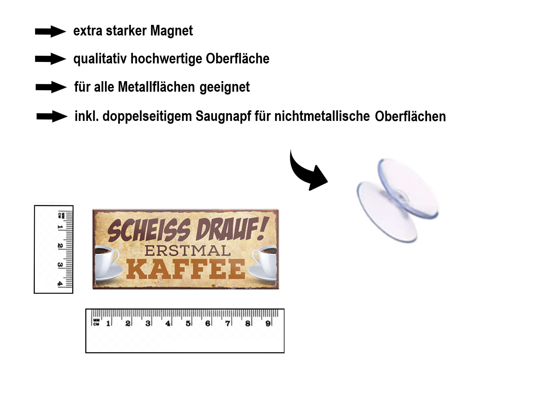 Der Super-Magnet ''Scheiss drauf! Erstmal Kaffee'' ist aus einem langlebigen Metall mit qualitativ hochwertiger Oberfläche. Ideal für Liebhaber und Fans von "genüsslichem Kaffeetrinkens" und definitiv ein Hingucker für jedermanns Auge.