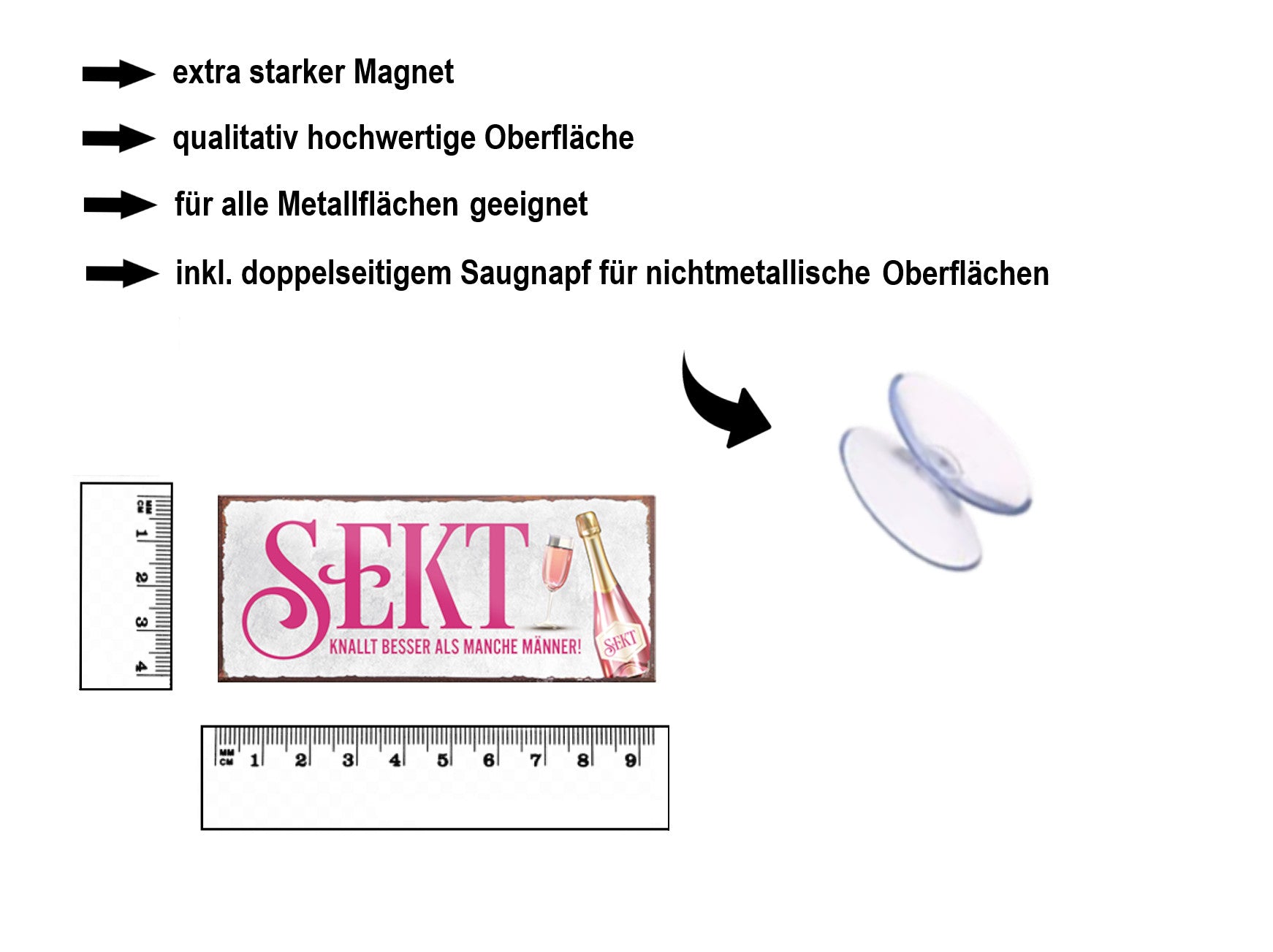 Der Super-Magnet ''Sekt knallt besser als manche Männer'' ist aus einem langlebigen Metall mit qualitativ hochwertiger Oberfläche. Ideal für Liebhaber und Fans von "alkoholischen Getränken" und definitiv ein Hingucker für jedermanns Auge.