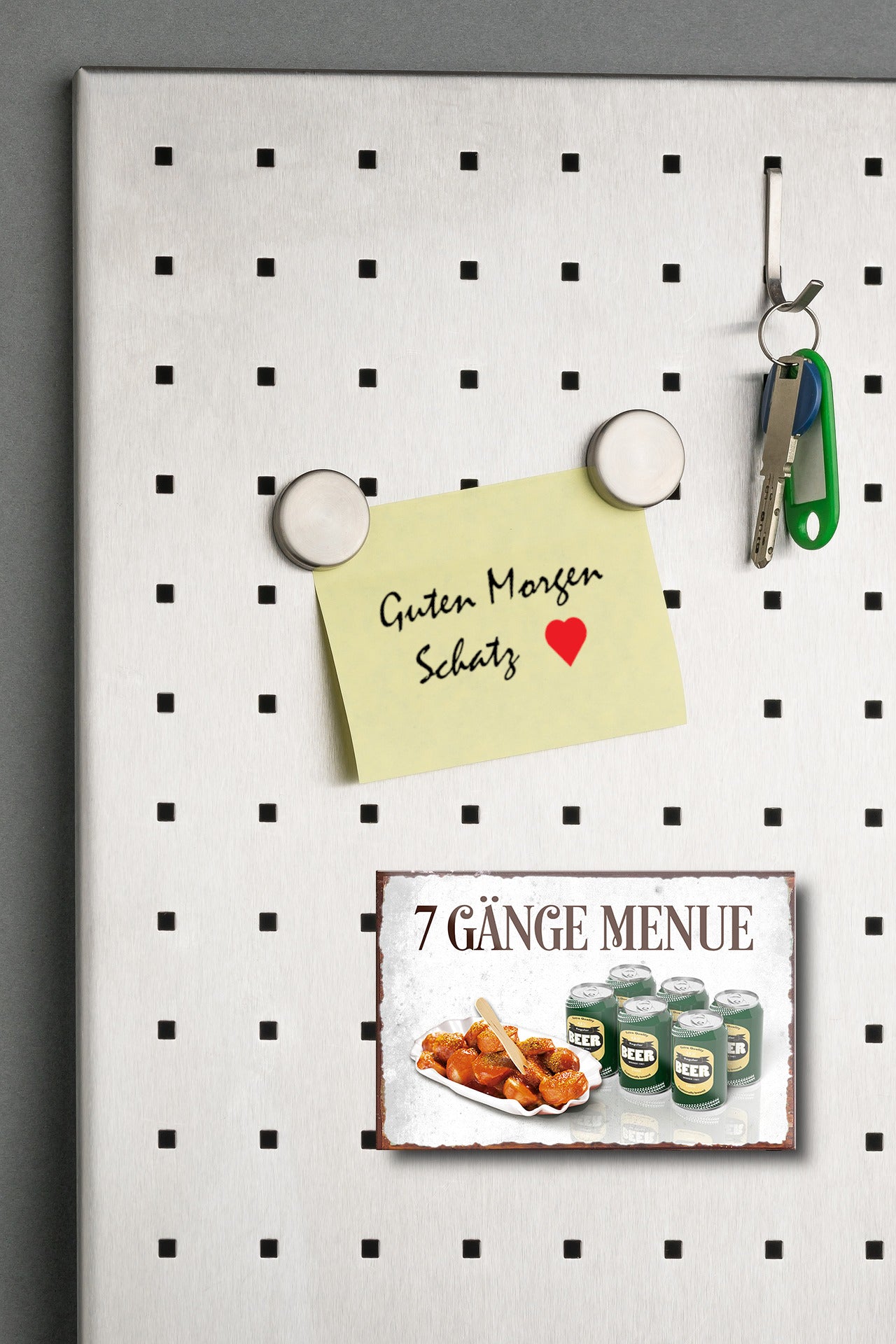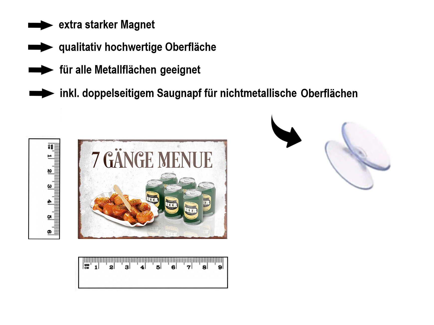 Der Super-Magnet ''Sieben Gänge Menü'' ist aus einem langlebigen Metall mit qualitativ hochwertiger Oberfläche. Ideal für Liebhaber und Fans von "alkoholischen Getränken" und definitiv ein Hingucker für jedermanns Auge.