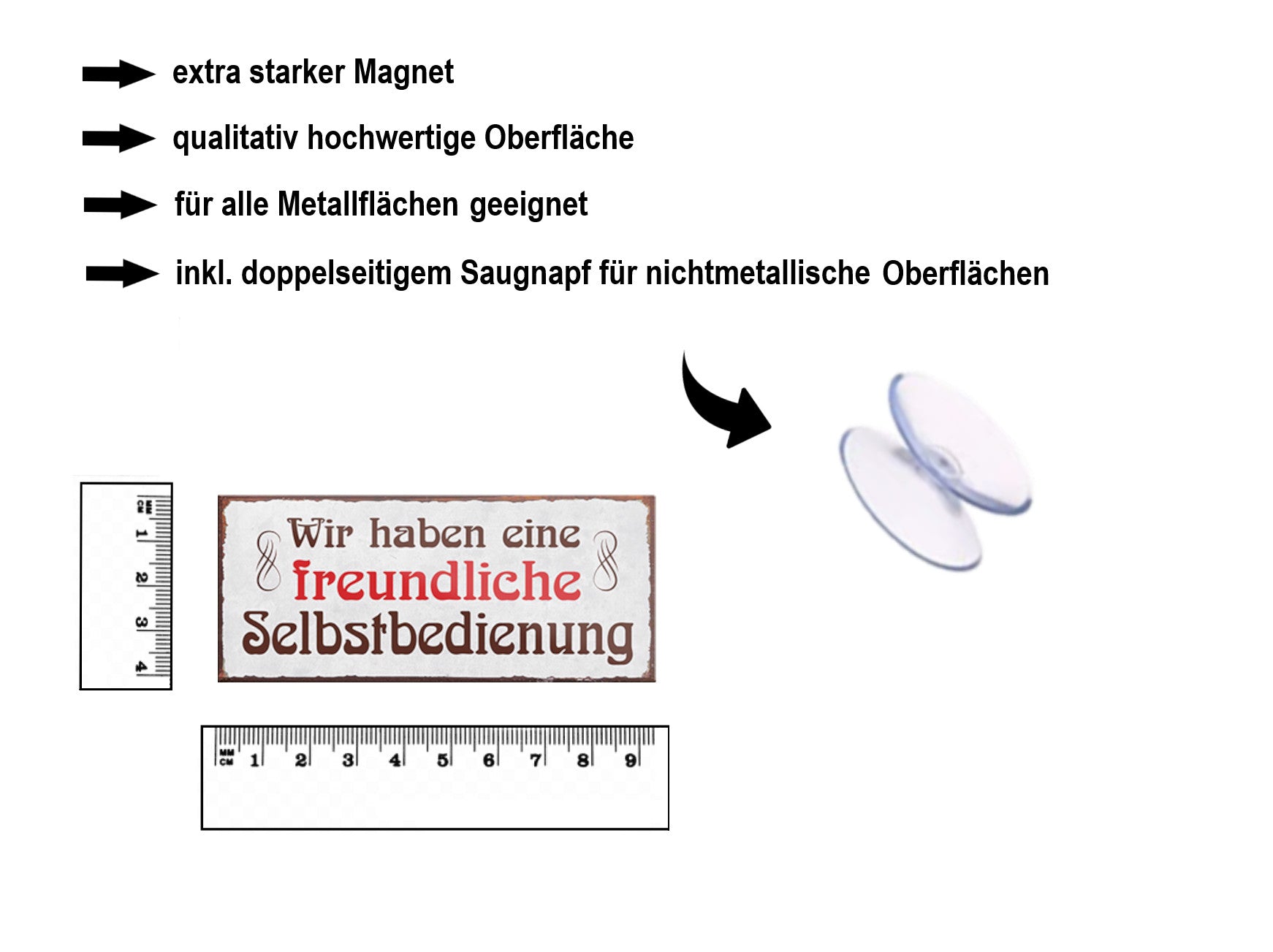 Der Super-Magnet ''Wir haben eine freundliche Selbstbedienung'' ist aus einem langlebigen Metall mit qualitativ hochwertiger Oberfläche. Ideal für Liebhaber und Fans von "genüsslichem Essen und Getränken" und definitiv ein Hingucker für jedermanns Auge.
