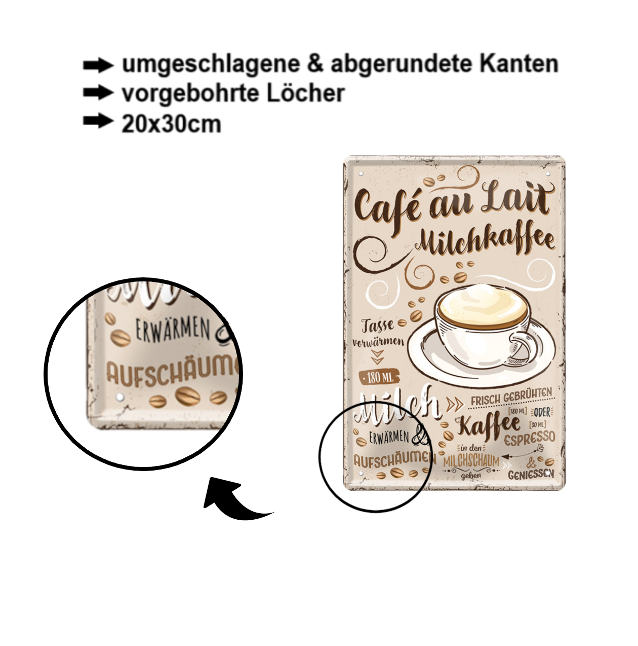 The tin sign "Cafe au Lait milk coffee" is made of high-quality tin with rounded and folded edges. Ideal for lovers and fans of "enjoyable food and drink" and definitely an eye-catcher for everyone's eye.
