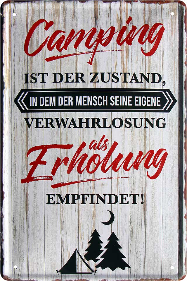 The tin sign ''Camping is the state in which neglect is perceived as relaxation'' is made from high-quality tin with rounded and folded edges. Ideal for lovers and fans of "camping and nature" and definitely an eye-catcher for everyone's eyes.
