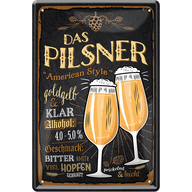 The tin sign ''The Pilsner American Style'' is made of high-quality tin with rounded and folded edges. Ideal for lovers and fans of "alcoholic beverages" and definitely an eye catcher for everyone.