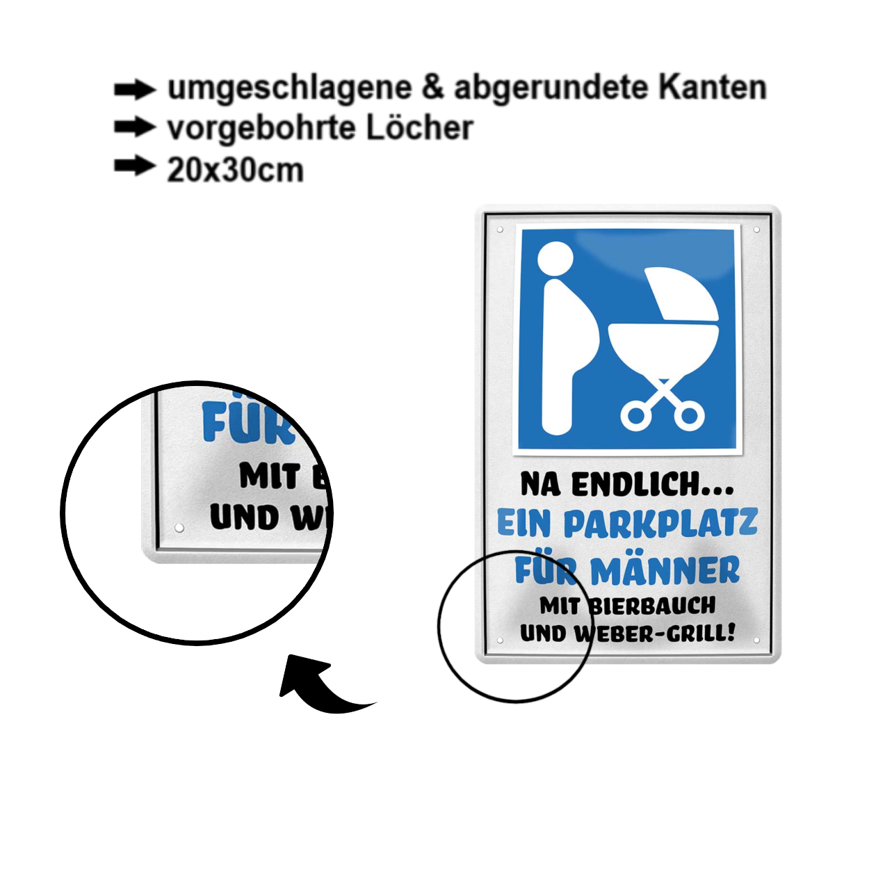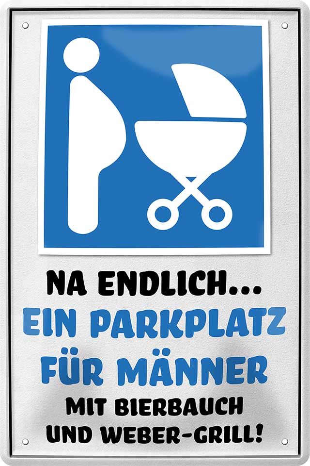 The tin sign "A parking lot for men beer belly" is made of high-quality tin with rounded and folded edges. Ideal for lovers and fans of "enjoyable food and drink" and definitely an eye-catcher for everyone's eye.