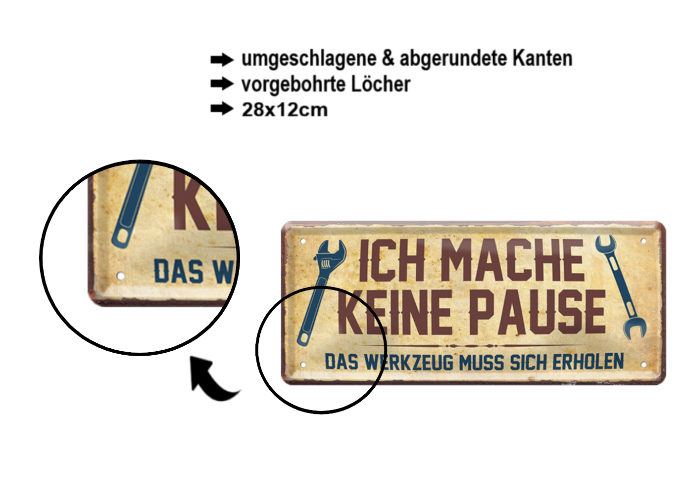 The tin sign ''I don't take a break. The tool must recover'' is made from high quality sheet metal with rounded and folded edges. Ideal for lovers and fans of ''motors and speed'' and definitely an eye catcher for everyone.