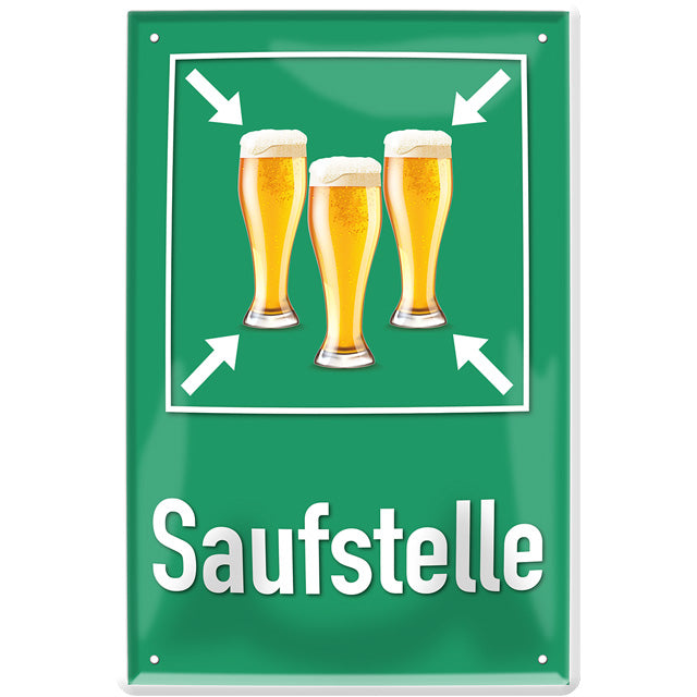 The tin sign "Saufstelle" is made of high-quality sheet metal with rounded and folded edges. Ideal for lovers and fans of "alcoholic beverages" and definitely an eye catcher for everyone.