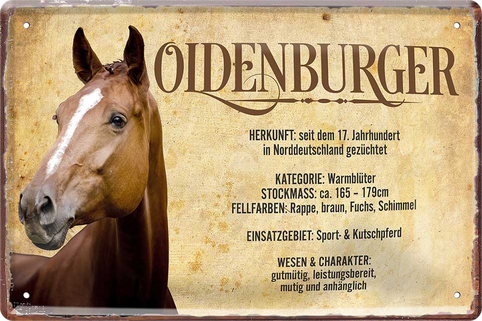 Das Blechschild ''Oldenburger'' ist aus einem qualitativ hochwertigen Blech mit abgerundeten und umgeschlagenen Kanten. Ideal für Liebhaber und Fans von ''Reitsport und Pferden'' und definitiv ein Hingucker für jedermanns Auge.