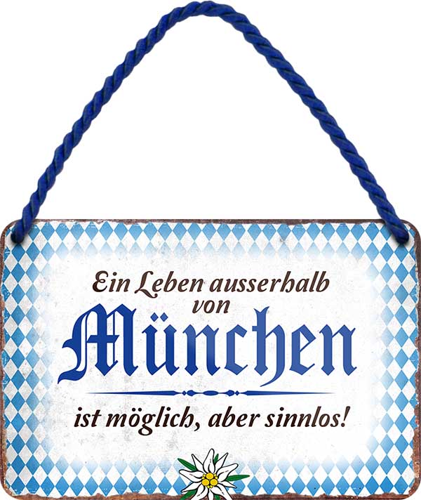 Das Blechschild ''Ein leben außerhalb von München ist möglich, aber sinnlos'' ist aus einem qualitativ hochwertigen Blech mit abgerundeten und umgeschlagenen Kanten. Ideal für Liebhaber und Fans von "Dialekt und Kultur" und definitiv ein Hingucker für jedermanns Auge.