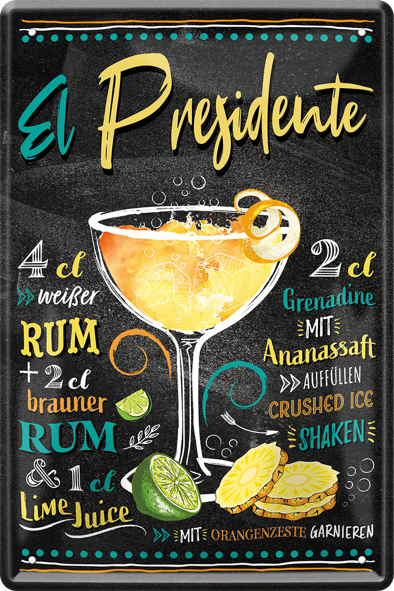 Das Blechschild ''El Presidente'' ist aus einem qualitativ hochwertigen Blech mit abgerundeten und umgeschlagenen Kanten. Ideal für Liebhaber und Fans von "alkoholischen Getränken" und definitiv ein Hingucker für jedermanns Auge.