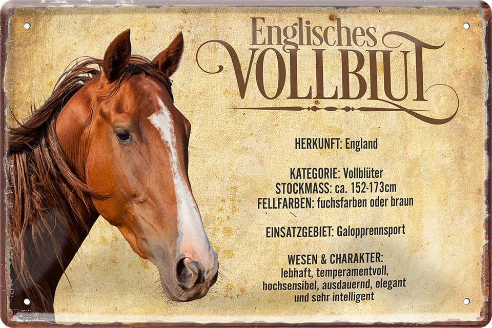 Das Blechschild ''Eng. Vollblut'' ist aus einem qualitativ hochwertigen Blech mit abgerundeten und umgeschlagenen Kanten. Ideal für Liebhaber und Fans von ''Reitsport und Pferden'' und definitiv ein Hingucker für jedermanns Auge.
