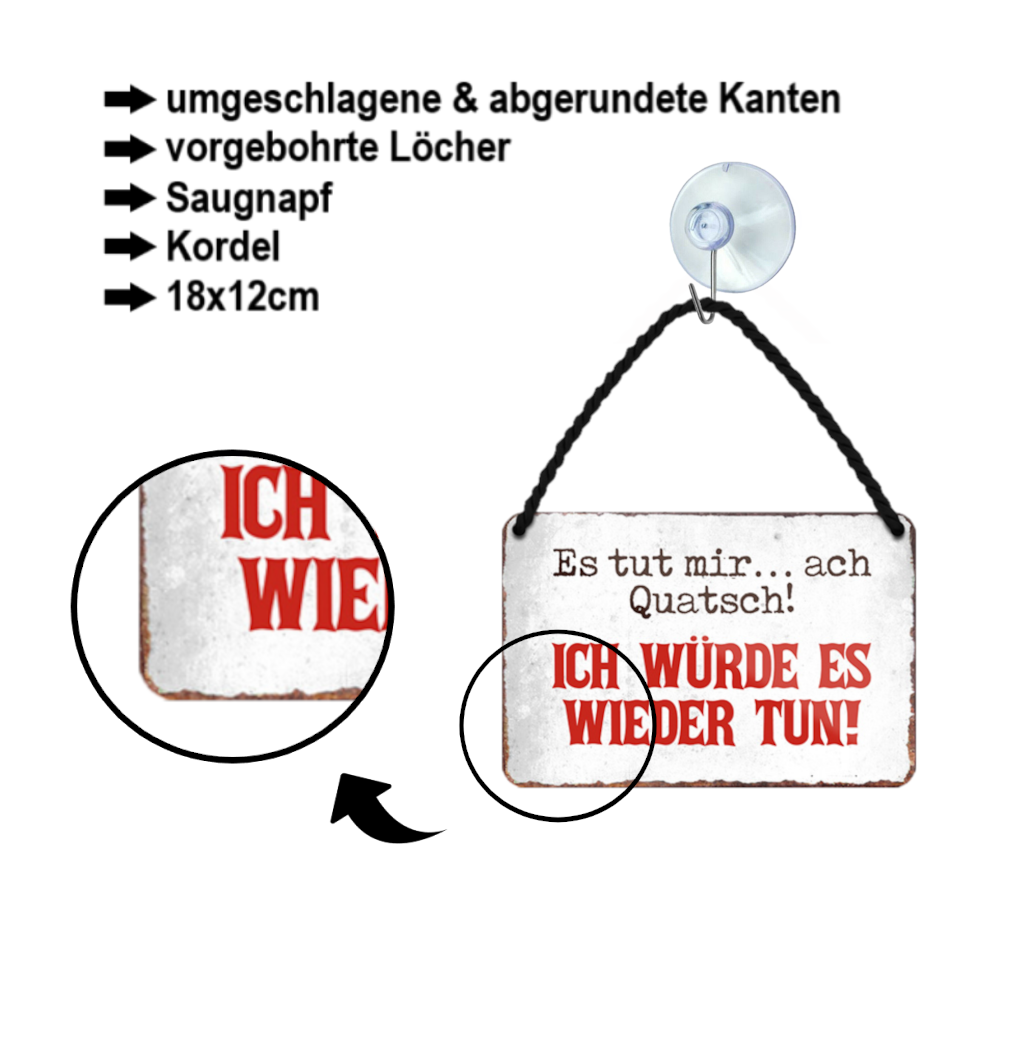Das Blechschild ''Es tut mir leid.. ach Quatsch'' ist aus einem qualitativ hochwertigen Blech mit abgerundeten und umgeschlagenen Kanten. Ideal für Liebhaber und Fans von ''ironischem und sarkastischem Humor'' und definitiv ein Hingucker für jedermanns Auge.