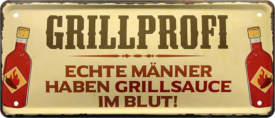Blechschild ''Grillprofi. Echte Männer haben Grillsauce im Blut'' 28x12cm