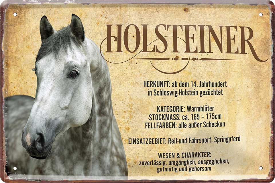 Das Blechschild ''Holsteiner'' ist aus einem qualitativ hochwertigen Blech mit abgerundeten und umgeschlagenen Kanten. Ideal für Liebhaber und Fans von ''Reitsport und Pferden'' und definitiv ein Hingucker für jedermanns Auge.
