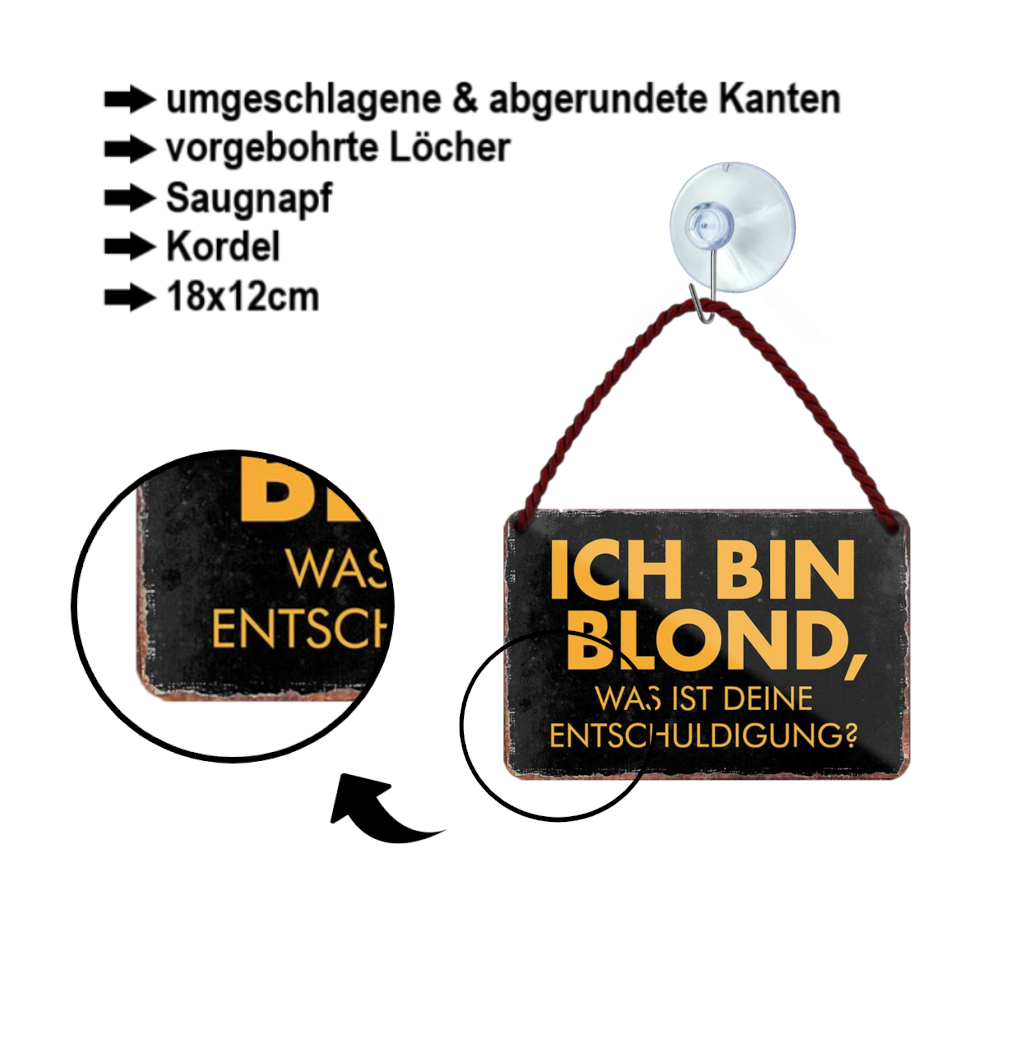 Das Blechschild ''Ich bin blond, was ist deine Entschuldigung'' ist aus einem qualitativ hochwertigen Blech mit abgerundeten und umgeschlagenen Kanten. Ideal für Liebhaber und Fans von ''ironischem und sarkastischem Humor'' und definitiv ein Hingucker für jedermanns Auge.