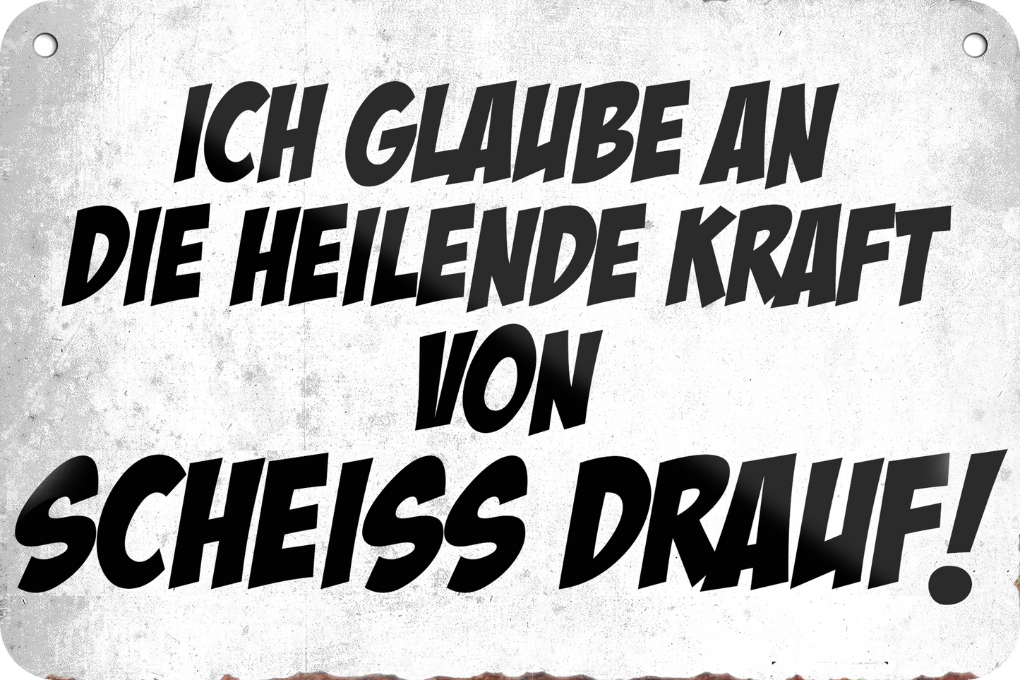 Das Blechschild ''Ich glaube an die heilige Kraft Scheiss drauf'' ist aus einem qualitativ hochwertigen Blech mit abgerundeten und umgeschlagenen Kanten. Ideal für Liebhaber und Fans von ''ironischem und sarkastischem Humor'' und definitiv ein Hingucker für jedermanns Auge.