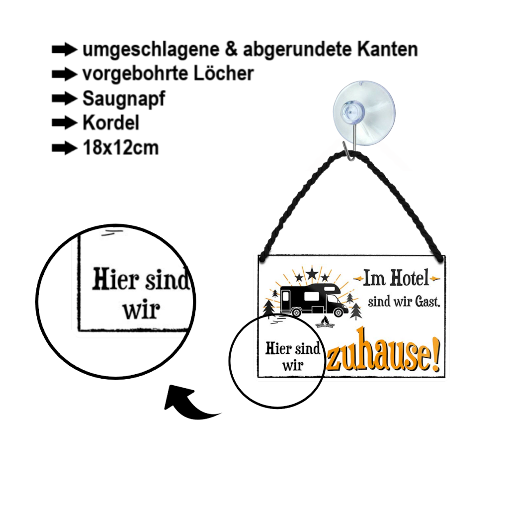Das Blechschild ''Im Hotel sind wir Gast.. hier Zuhause'' ist aus einem qualitativ hochwertigen Blech mit abgerundeten und umgeschlagenen Kanten. Ideal für Liebhaber und Fans von "Camping und Natur" und definitiv ein Hingucker für jedermanns Auge.