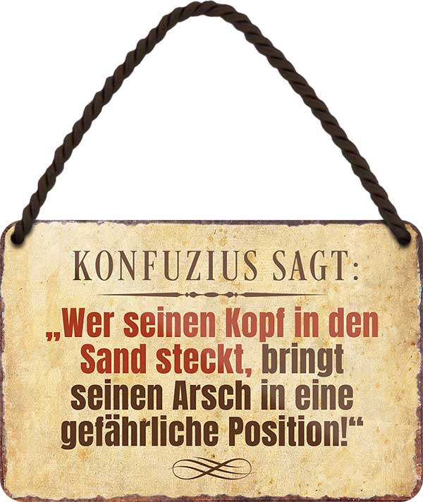 Blechschild ''Konfizius sagt, wer seinen Kopf in den Sand steckt.. Position'' 18x12cm