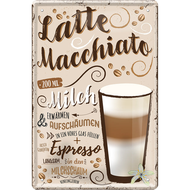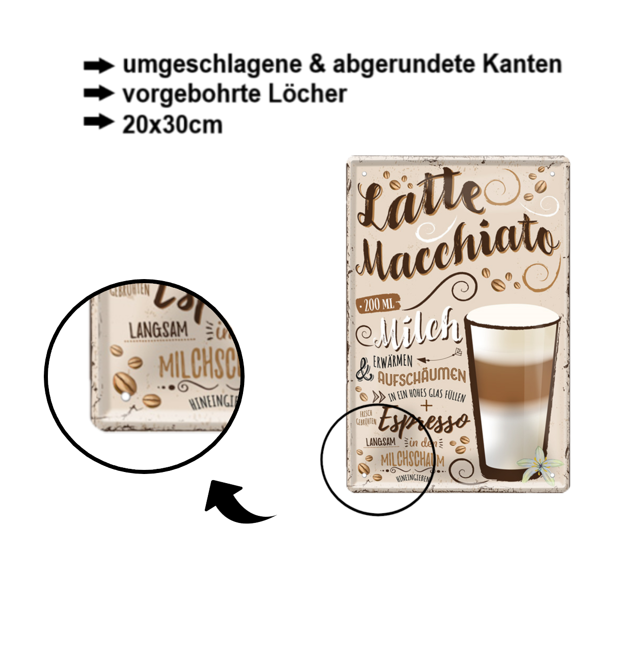 Das Blechschild ''Latte Macchiato'' ist aus einem qualitativ hochwertigen Blech mit abgerundeten und umgeschlagenen Kanten. Ideal für Liebhaber und Fans von "genüsslichem Essen und Getränken" und definitiv ein Hingucker für jedermanns Auge.