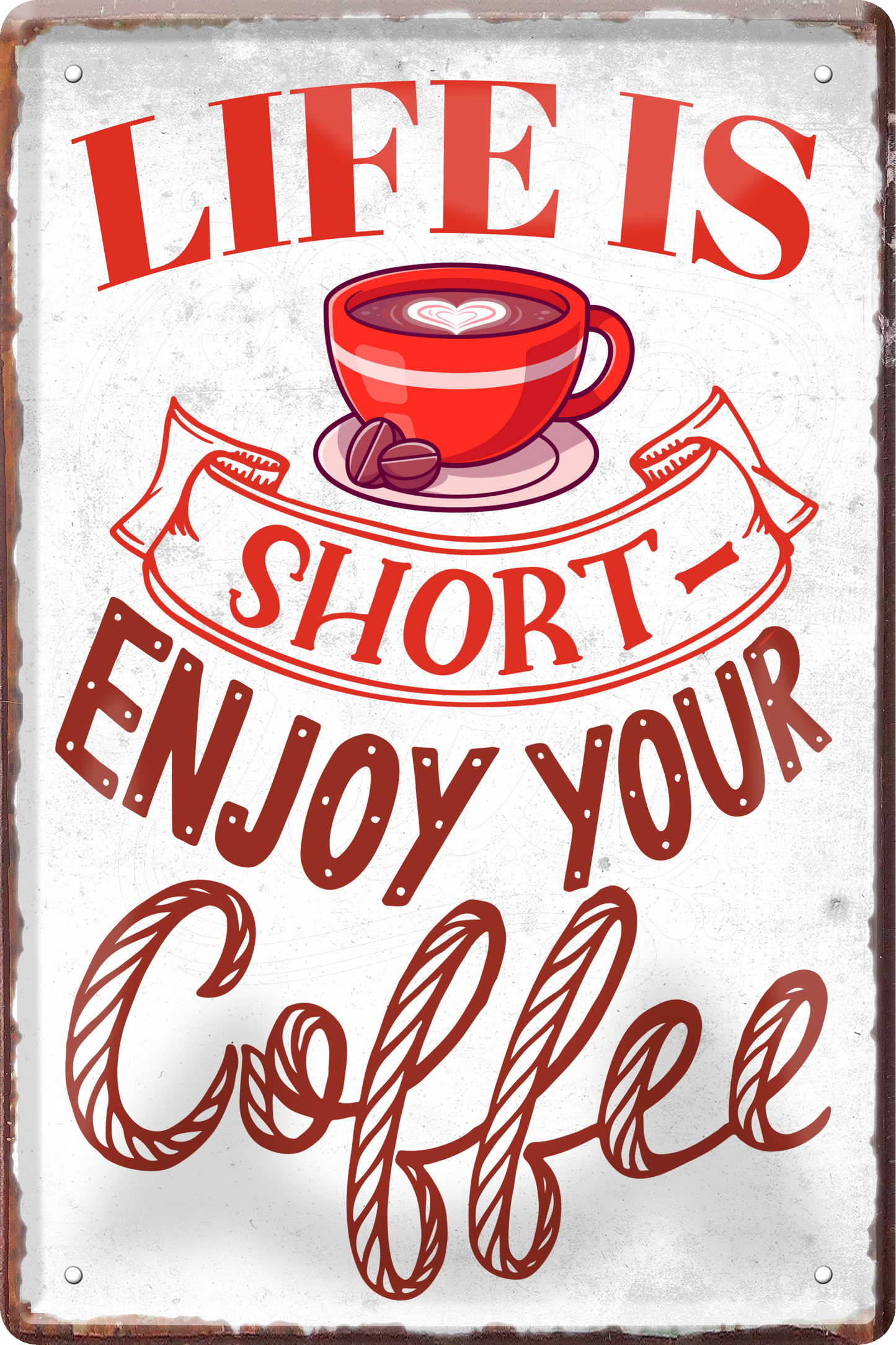 Das Blechschild ''Life is short enjoy your coffee'' ist aus einem qualitativ hochwertigen Blech mit abgerundeten und umgeschlagenen Kanten. Ideal für Liebhaber und Fans von "genüsslichem Essen und Getränken" und definitiv ein Hingucker für jedermanns Auge.