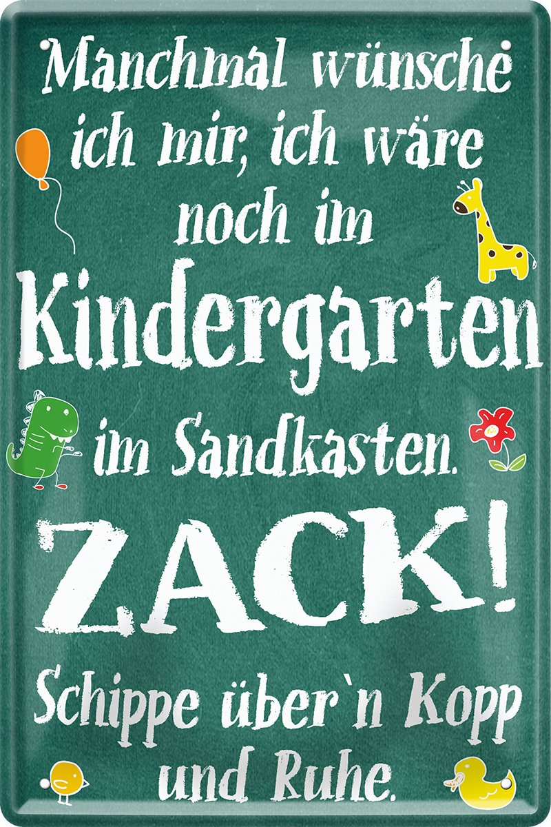 Das Blechschild ''Manchmal wünsche ich mir.. Kindergarten'' ist aus einem qualitativ hochwertigen Blech mit abgerundeten und umgeschlagenen Kanten. Ideal für Liebhaber und Fans von ''ironischem und sarkastischem Humor'' und definitiv ein Hingucker für jedermanns Auge.