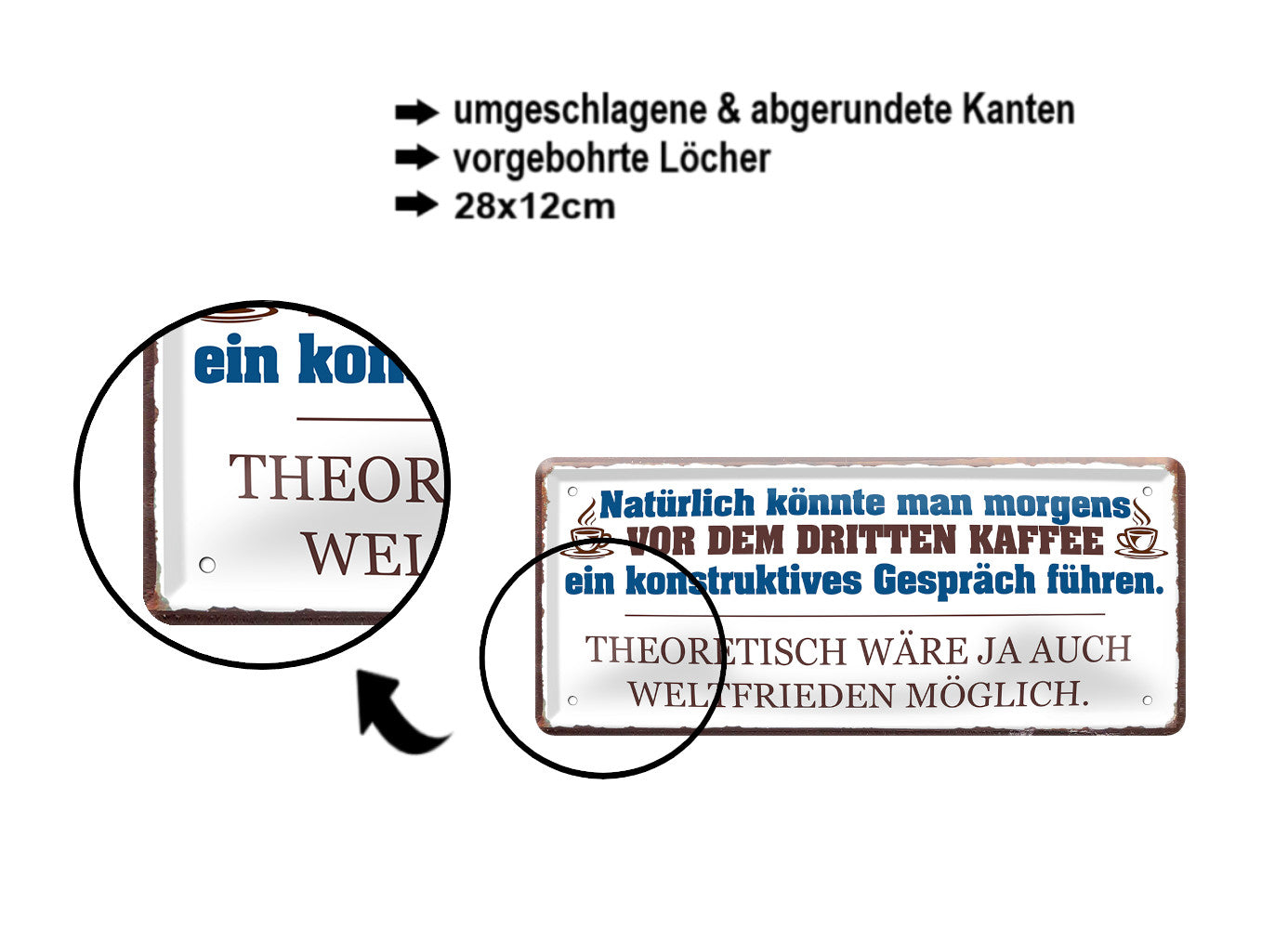 Das Blechschild ''Natürlich könnte man morgens vor dem dritten Kaffee'' ist aus einem qualitativ hochwertigen Blech mit abgerundeten und umgeschlagenen Kanten. Ideal für Liebhaber und Fans von "aromatischem Kaffee" und definitiv ein Hingucker für jedermanns Auge.